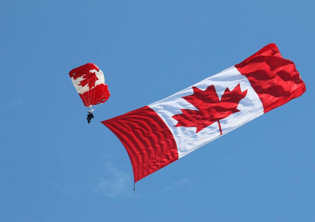 The sight of the GERONIMO! Skydiving Team flying our giant 1,200 sq ft American and Canadian flags during opening